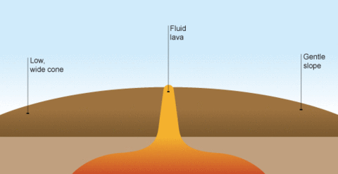 | Characteristics of a shield volcano | -Cone with wide base, gentle slopes. -Made of lava only. -Regular and frequent eruptions -Lava pours out, little violence |