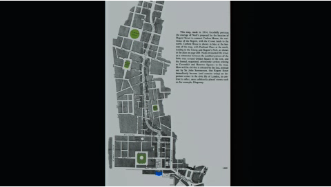 | Carlton House Terrace entlang eine Prachtstraße gestaltet, die von St James über die Regent Street, Portland Place und Park Square zum Regent’s Park führte. | |