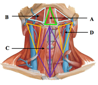 | A - submental triangle B - Submandibular triangle C - muscular triangle D - carotid triangle | |