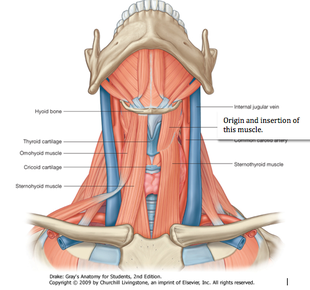 | Name the four infrahyoid/strap muscles. | Sternohyoid, omohyoid, sternothyroid, thyrohyoid. |