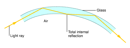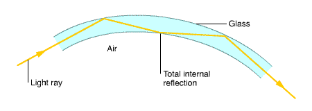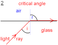 | Explain why total internal reflection occurs. | Total internal reflection occurs when waves pass form a dense to a less dense medium. If the angle of the incident ray is greater then the materials critical angle, then all the waves are reflected back into the medium. |