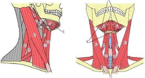 | 1. M. digàstric 2. M. llarg del cap 3. M. estilohioïdal 4. M. milohioïdal 5. M. digàstric 6. M. esternoclidomastoïdal 7. M. omohioïdal 8. M. escalè mitjà 9. M. escalè anterior 10. M. esternotirohioïdal 11. M. esternohioïdal |