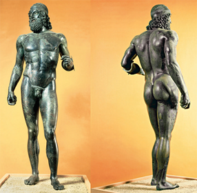| Riace Warrior c. 460–450 BCE, Bronze, 6' 9" Found in the sea off Riace, Italy. | |