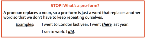 | Pronominalisation: eg. [The child] ate the ice-cream. | Replace the chunk of language with a pronoun / pro-form. The child ate the ice-cream. She ate the ice-cream. |