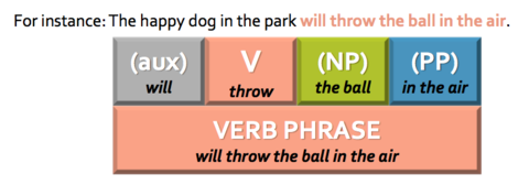 | The happy child ate the very tasty cake rather quickly. | • Noun phrases (the happy child; the very tasty cake) • Verb phrase (ate the very tasty cake rather quickly) • Adjectival phrases (happy; very tasty) • No prepositional phrases • Adverbial phrases (very; rather quickly) |