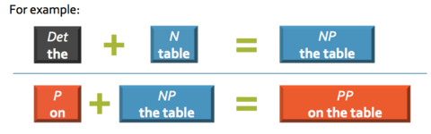 | What different kinds of phrases do we have? | • Noun phrases (NP) – the computer, a really tall building, London... • Verb phrases (VP) – survive, win a prize, passed the exam, is afraid... • Adjectival phrases (AP, sometimes AdjP) – green, very fast, absolutely great... • Prepositional phrases (PP) – on the phone, in the garden... • Adverbial phrases (AdvP) – slowly, sometimes, very rarely, rather often... |