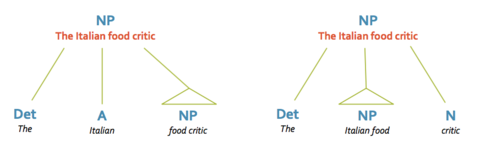 | How can we display ambiguity? Example: The Italian food critic | We can use tree diagrams to highlight syntactic ambiguity. |