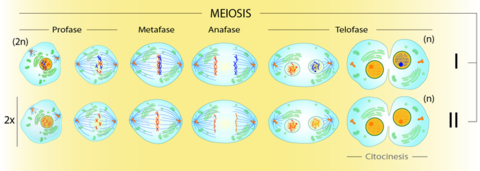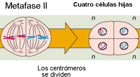 | MEIOSIS ES UN TIPO DE DIVISIÓN CELULAR QUE FORMA CUATRO CÉLULAS HIJAS CON LA MITAD DE CROMOSOMAS DE LA CÉLULA MADRE, ES EL PROCESO DE FORMACIÓN DE GAMETOS Y CONSTA DE DOS DIVISIONES CELULARES: MEIOSIS I Y MEIOSIS II. MEIOSIS I PASOS 1. PROFASE I: LOS CROMOSOMAS SE VAN CONDENSANDO 2. PROFASE I: LOS CROMOSOMAS HOMÓLOGOS SE UNEN FORMANDO UNA SINAPSIS. 3.PROFASE I: COMIENZA LA RECOMBINACIÓN ENTRE CROMOSOMAS HOMÓLOGOS. 4. PROFASE I: SE HACEN VISIBLES LOS QUIASMAS. 5. PROFASE I: DESAOPARECE LA CARIOTECA. 6. METAFASE I: LOS CROMOSOMAS HOMÓLOGOS SE UNEN AL HUSO CROMÁTICO. 7. ANAFASE I: SE SEPARAN LOS CROMOSOMAS HOMÓLOGOS. 8. TELOFASE I: LOS NÚCLEOS SE ORGANIZAN FORMANDO DOS CÉLULAS HIJAS. | MEIOSIS II EL PASO DE LA MEIOSIS I A LA MEIOSIS II ES INMEDIATO, NO OCURRE INTERFASE NI DUPLICACIÓN DE CROMOSOMAS. >PROFASE II: LOS CROMOSOMAS DE CROMÁTIDAS HERMANAS SE VAN CONDENSANDO, SE DUPLICAN Y SE SEPARAN LOS CENTROSOMAS. >PROFSE ANAFASE II: SE SEPARAN LAS CROMÁTIDAS HERMANAS. >METAFASE II: SE ALINEAN LOS CROMOSOMAS EN LA ZONA ECUATORIAL. >TELOFASE II: SE DIVIDEN LAS CÉLULAS FORMANDO 4 GAMETOS HAPLOIDES. |