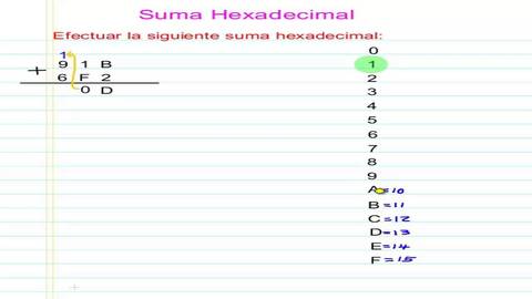 | SUMA DE HEXADECIMALES | suma de hexadecimales.Sumar dígitos que se encuentran en la primer columna se coloca un acarreo en la siguiente columna, el valor del acarreo depende de las veces que haya superado la base |
