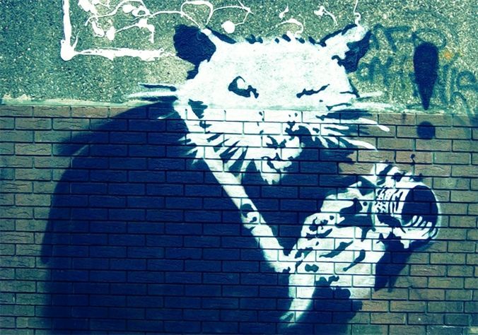 | Banksy, Rat with Camera, 2005, stencil and spray paint | |