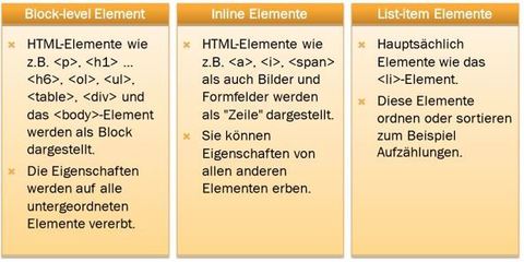 | Ordnen sie: div, h1, span, li, b und p den Gruppen-Elementen die sie kennengelernt haben zu. | |