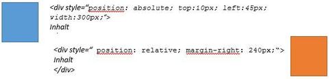 | Welche Unterschiede gibt es bei der relativen und der absoluten Positionierung von Elementen? Geben sie jeweils ein CSS Beispiel für ein div Element an. | Relativ = relative Positionierung, gemessen am Vorgänger-Element. Absolut = absolute Positionierung, gemessen vom Fensterrand, wird beim scrollen mit verschoben. |