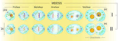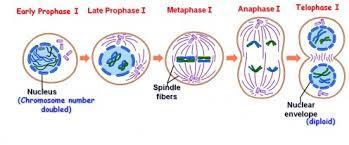 | Meiosis I esta dividida en profase I (leptoteno, zigoteno, paquiteno, diploteno y diacinesis), metafase I, anafase I y telofase I | Meiosis II es inmediato despues de la I, no ocurre interfase ni duplicacion de los cromosomas, se divide en profase II, metafase II, anafase II y telofase II. |