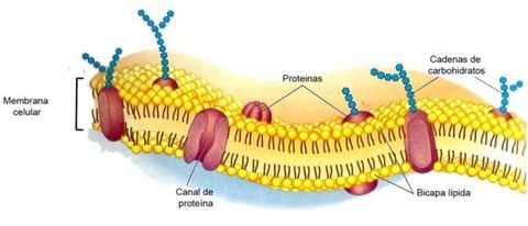 | BICAPA LIPÍDICA la membrana celular esta formada por una doble capa de fosfolípidos enfrenados, | Entre los fosfolipidos hay 2 tipos de proteínas: Integrales y Periféricas que van en el interior y exterior de la capa. |