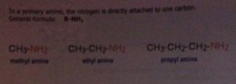 | Naming amines | named by using the name of the alkyl group attached to the N, followed by the word amine. |