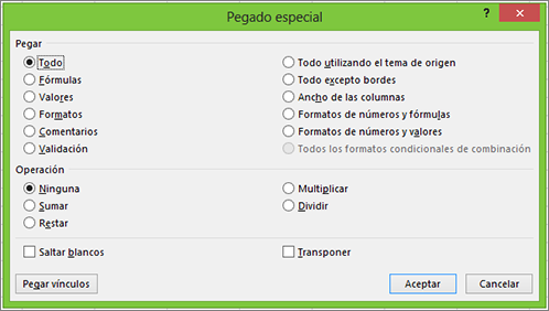 Opciones de pegado especial