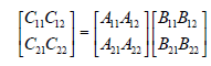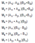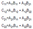 Si A, B y C son matrices de orden nxn. Asumiendo que n es potencia exacta de 2, se puede dividir cada matriz en cuatro de orden n/2 y n/2.