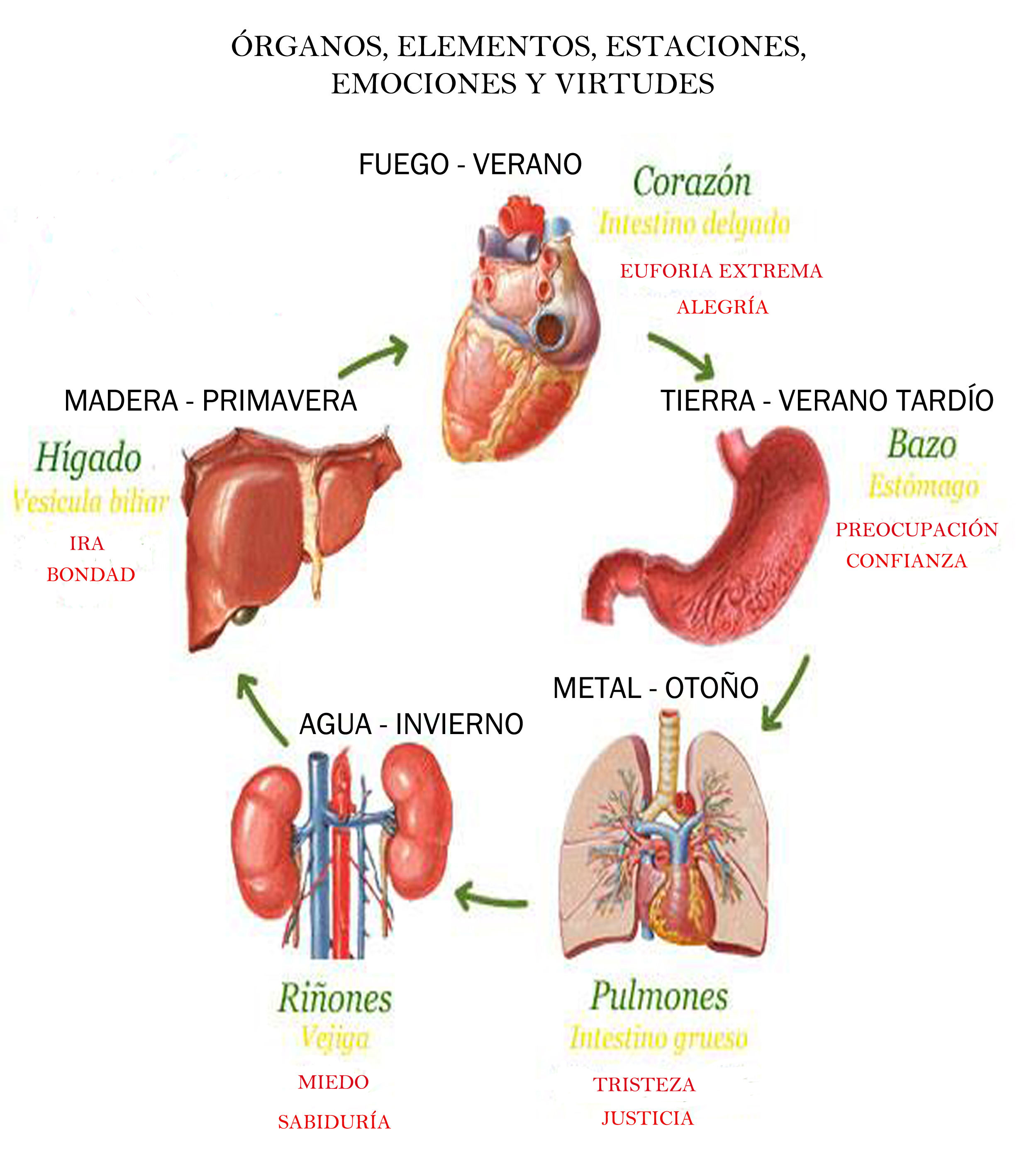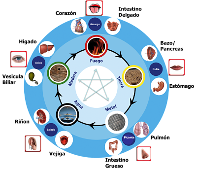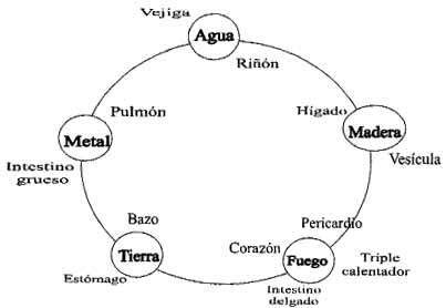 Cada órgano Yin forma pareja con uno Yang y cada una de estas parejas se identifica con cada uno de los 5 elementos y establecen las relaciones de oposición e interdependencia.