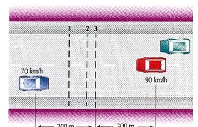 El auto azul circula a 70 km/h y el rojo a 90 km/h. ¿Dónde es más probable que sus conductores estimen el punto en que se producirá el encuentro de ambos vehículos?