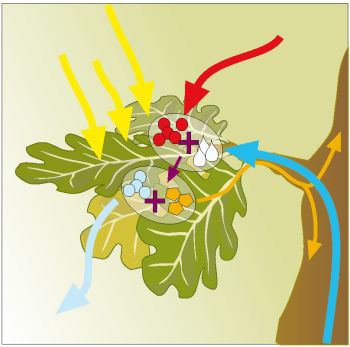 Als Nebenprodukt entsteht Sauerstoff, der durch kleine Blattöffnungen – zusammen mit Wasserdampf – abgegeben wird.