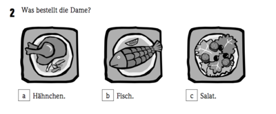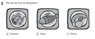 Dame: Nein, danke, ich mag keinen Fisch. Ober: Dann vielleicht Hähnchen mit Pommes frites oder unseren Chefsalat mit Ei und Schinken?