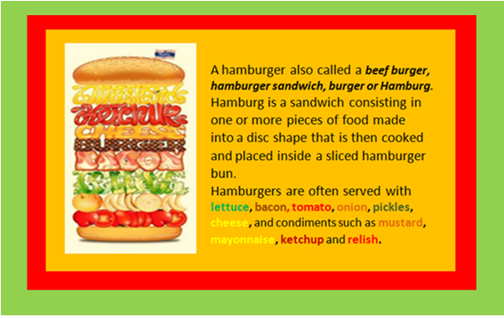 ( condiments, shape, Hamburgers ) are often served with ( lettuce, condiments, cheese ), bacon, ( mayonnaise, tomato, pickles ), onion, ( pickles, lettuce, condiments ), ( tomato, mustard, cheese ), and ( condiments, pickles, ketchup ) such as mustard, ( mayonnaise, pickles, condiments ), ketchup and ( cheese, mayonnaise, relish ).