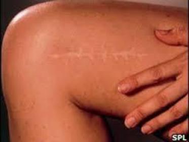 | CICATRIZ QUELOIDEA Son cicatrices gruesas que forman un relieve sobre la piel y se expanden más allá del sitio de la herida. | |