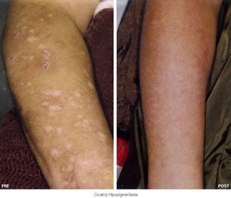 | CICATRIZ HIPOPIGMENTADA En las cicatrices hipopigmentadas, la piel pierde la capacidad de producir melanina en esa zona, como secuela del traumatismo que las originó; son cicatrices donde los melanocitos están ausentes. | |