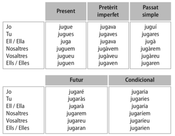 | Completa les formes simples d’indicatiu del verb jugar: present, pretèrit perfet, passat simple, futur, condicional | |