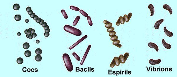 -Cocs (tenen forma de coco) -Bacils (tenen forma de bala) -Espirilis (tenen forma d'espiral) -Vibrions (tenen forma de coma) |