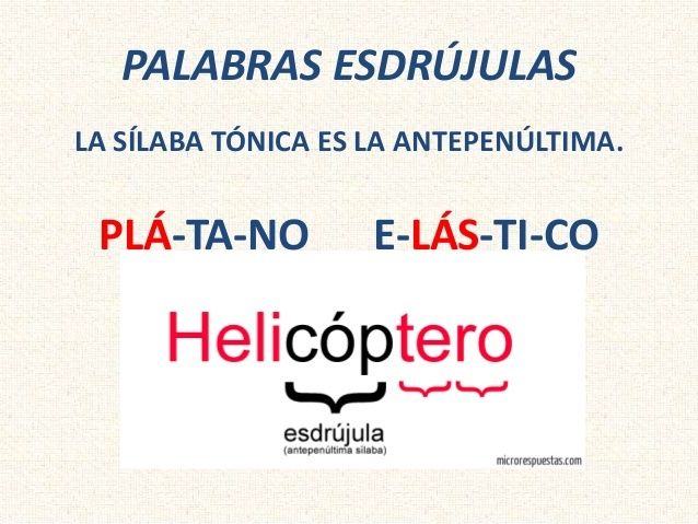 | Esdrújulas Son las que llevan la mayor fuerza de voz en la antepenúltima sílaba | Sobresdrújulas Son las que llevan la mayor fuerza de voz antes de la antepenúltima sílaba. |