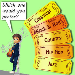 Here you have the different types of music. You can choose whatever you want or tell me that in spanish and I will help you to tell it in english. |