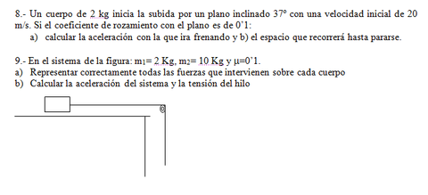 | 8.- Un cuerpo de 2 kg inicia la subida por un plano inclinado 37º con una velocidad inicial de 20 m/s. Si el coeficiente de rozamiento con el plano es de 0’1: a) calcular la aceleración con la que ira frenando y b) el espacio que recorrerá hasta pararse. | ? |