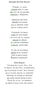 | ARTE | Los poemas se pueden dividir en dos tipos en función del número de sílabas de sus versos: Arte Menor--> los poemas cuyos versos tienen ochosílabas o menos son de arte menor Arte Mayor--> Los poemas cuyos versos tienen 9 o más sílabas son de arte mayor. |