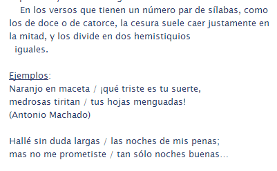 Cesura : es la pausa versal que se produce en el interior de un verso , formado por mas de 11 sílabas. Y esto hace que se divida el verso en dos partes iguales llamadas hemistiquios.
