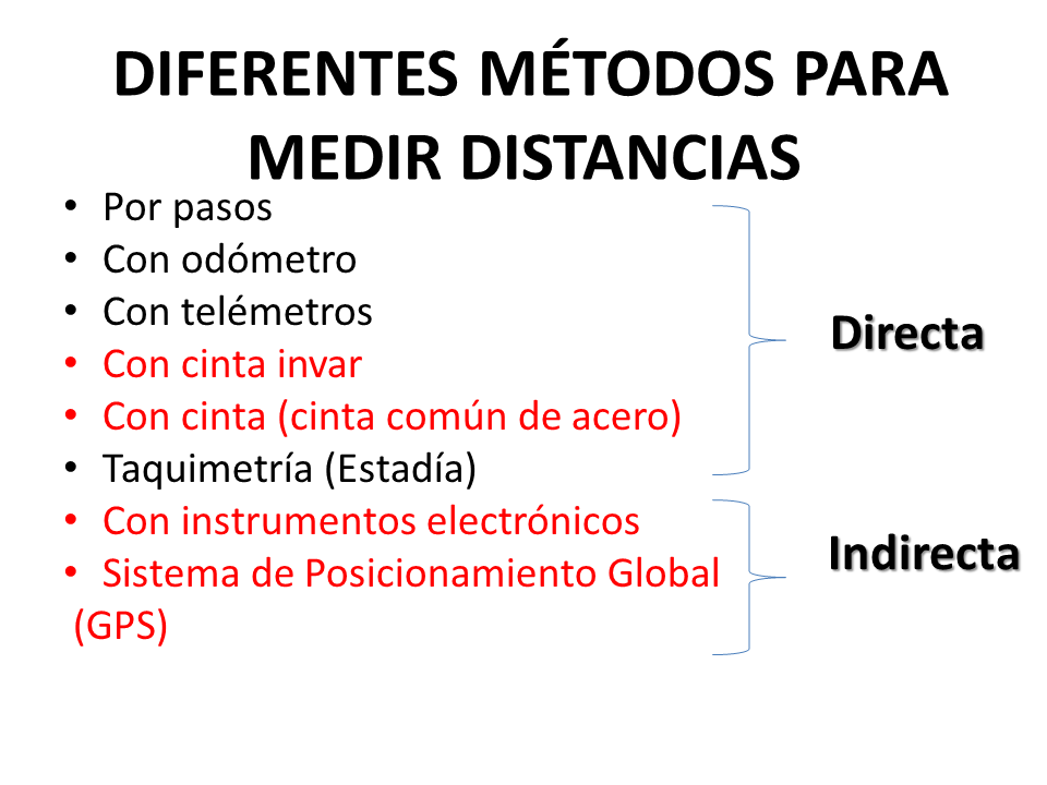 Medición de distancias cortas con una regla Si se debe medir una distancia corta sobre un terreno horizontal, se procede primero a señalar cada extremidad con un jalón. Se apoya la regla sobre el suelo, haciendo coincidir el principio con el primer jalón, verificando que siga la dirección de la recta que se quiere medir. Se marca con una estaca el otro extremo de la regla. Se desplaza la regla hasta que su extremo coincide con la estaca recién colocada. Se repite la operación hasta llegar al otro extremo de la recta que se quiere medir, cuidando de anotar el número de veces que se ha desplazado la regla. En general, basta una parte de la longitud de la regla para medir el último segmento de la recta. Es importante estar seguro de leer correctamente la graduación de la regla |