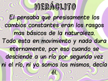| Parménides: El pensaba que todo lo que hay, ha existido desde siempre. También pensaba que ningún verdadero cambio era posible. No había una explicación de concreta, esa explicación era infinita. | |