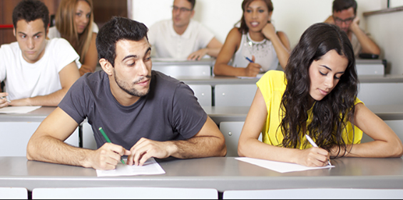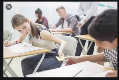 | Describe what you see in this picture. | There are two boys who are copying themselves during an exam. |
