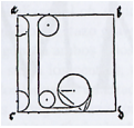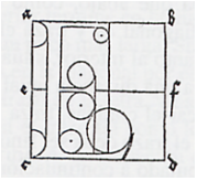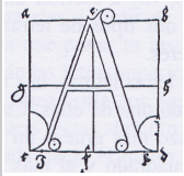 | LETRA A: Se designan los vértices de su cuadrado con a, b, c, d (esto se hace en todas las letras). Se divide este cuadrado con dos líneas dispuestas en cruz, la vertical e-f y la horizontal g-h. Se ponen dos puntos i y k en el lado inferior c-d, cada uno metido hacia dentro una décima parte de longitud. Se hace un trazo fino de letra desde i hasta la parte superior del cuadrado, y desde allí se vuelve a bajar con el trazo ancho, de modo que el exterior de ambos trazos toque los puntos i y k. En el medio queda un triángulo, encontrándose el punto e en el centro de la parte superior de la letra. Se une la a por debajo de la horizontal g-h, dando por ancho a este trazo una tercera parte del mayor. En la parte superior del trazo ancho se hace un arco de círculo hacia la derecha, rematando la letra en su parte superior con una línea serpentina, cuya parte cóncava se oriente hacia el trazo fino. Se redondea los dos pies de la letra, de modo que toquen los vértices c y d del cuadrado, con un arco de círculo que tenga por medio diámetro un séptimo del lado del cuadrado. | |