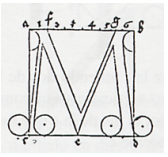 | LETRA M: Se divide el lado a-b del cuadrado abad en seis partes iguales, y se separan las dos extremas con dos puntos f y g. Se dibuja desde aquí el trazo grueso interior con el vértice en el punto e y luego se vuelve a dibujar hacia arriba el trazo fino, de forma que entre f y g quede un espacio vacío. Así, la letra resulta más amplia. Se deja como estaba la parte superior de los dos trazos laterales, el fino de la izquierda y el grueso de la derecha, pero se desplaza la inferior hasta los dos vértices c y d. Se redondean los vértices exteriores del extremo superior y se curvan los dos trazos verticales de la parte inferior en dos trazos verticales en ambos lados. La curvatura sobresaldrá del cuadrado en d. Para hacer en punta la parte de arriba de la m se practica un corte romo en la parte superior de los trazos. | |
