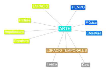 | El arte se clasifica en : espacio (pintura, escultura y arquitectura), tiempo (música y literatura) y espacio temporales (teatro y cine). | |