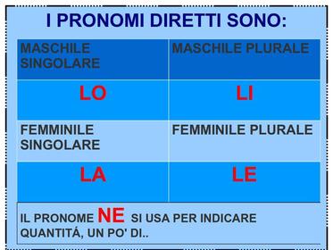 | ESERCITIAMO | COMPLETA CON I PRONOMI DIRETTI 1- Scrivo un bigliettino e ....... mando alla mamma. 2- Ana copia una ricetta e .....prepara per la cena. 3- Prendo le sigarette e.... fumo una. 4- Uso i pennarelli e ....... lascio a scuola. |