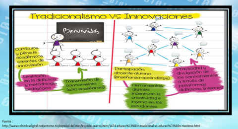 | cambio en los profesores tradicionales | hay un enorme labor en la formación de agentes educativos ya que la mayoría de los maestros y profesores son analfabetas funcionales en el nuevo espacio social. |