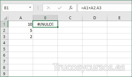 | #¡NULO! | aparece cuando incluimos un espacio entre dos rangos dentro de la fórmula para indicar una intersección, pero los rangos no tienen celdas comunes |