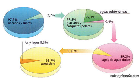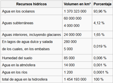 | El contenido total de agua del planeta se estima en 1400 trillones de litros, aproximadamente 1,4×1021 kg. La mayor parte, un 97,23 %, la almacenan los océanos y los casquetes polares un 2,15 %; los acuíferos, la verdadera reserva para el hombre, un 0,61 %. Los lagos encierran el 0,009 %, mientras que la cifra desciende en los mares interiores a un 0,008 %. La humedad del suelo acumula el 0,005 % la atmósfera el 0,001 % y los ríos tan sólo 0,0001 % del total. | |