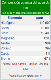 | composición del oceano | En los océanos se han encontrado al menos 77 elementos, siendo con mucho los más importantes el sodio y el cloro, que junto con el magnesio y el bromo, son de los pocos que se explotan comercialmente a partir del agua de mar. En la actualidad, se supone que prácticamente todos los elementos están presentes en los océanos. |