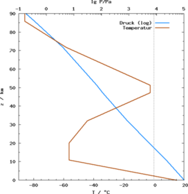 | Representación de la variación de la presión con la altura | Variación de la temperatura y del logaritmo de la presión con la altura para la atmósfera de la Tierra. Si representamos el logaritmo de la presión o de la densidad en función de la altura obtendríamos una línea recta si la atmósfera fuese isoterma, es decir, si la escala de temperatura no variase con la altura. La escala de altura es pequeña si la temperatura es baja y ello significa que la presión y la densidad decrecen rápidamente. Si la tempreratura es alta la escala es grande y varían suavemente. |
