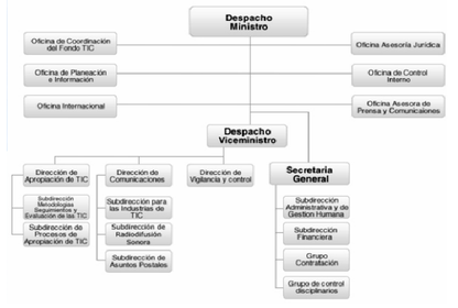 | Entes que supervisan al ministerio de las TIC | > Congreso de la república > Ministerio de hacienda y crédito público > Dep nacional de planeación > Contraloria general de la república > Procuraduría general de la nación > Contaduría general de la nación |