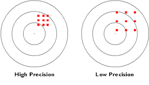 | Precisión | Grado de CERCANÍA que existe entre un conjunto de resultados de medición de la misma magnitud. Esta se puede calcular por medio de la desviación estandar o cualquier parametro estadistico de dispersión |