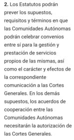 | Artículo 145.2 ¿Dónde se recogerán preverán los supuestos en que las Comunidades Autónomas podrán celebrar convenios entre sí? ¿En cuáles casos requiere comunicación a las CCGG y en cuáles requiere autorización de las mismas? | |